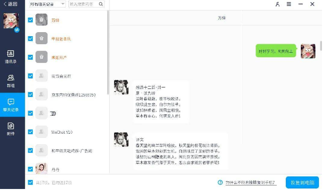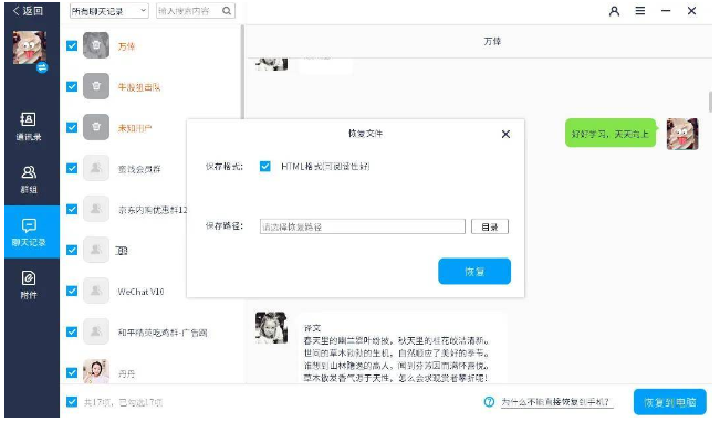 4、篩選出誤刪的微信聊天記錄,確認勾選,然后點擊右下角的“恢復到電腦”按鈕,即可完成。
