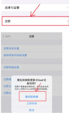 4、在還原功能內,找到并點擊抹掉所有內容和設置,點擊備份后抹掉,就可以將數據備份,那就還原手機數據了。