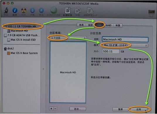5、選擇要安裝系統的硬盤,點擊【分區】,分區布局選擇【1個分區】,格式選擇【Mac OS擴展(日志式)】,然后點擊應用。