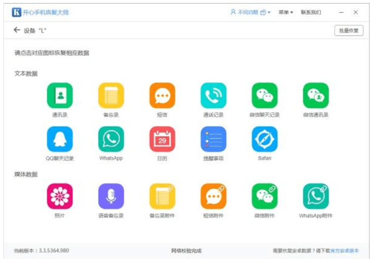 1、下載并安裝開心手機恢復大師,運行軟件。利用【通過設備掃描恢復】模式,點擊【下一步】。進入軟件的功能界面,點擊圖標恢復相對應的數據,點擊【通訊錄】。