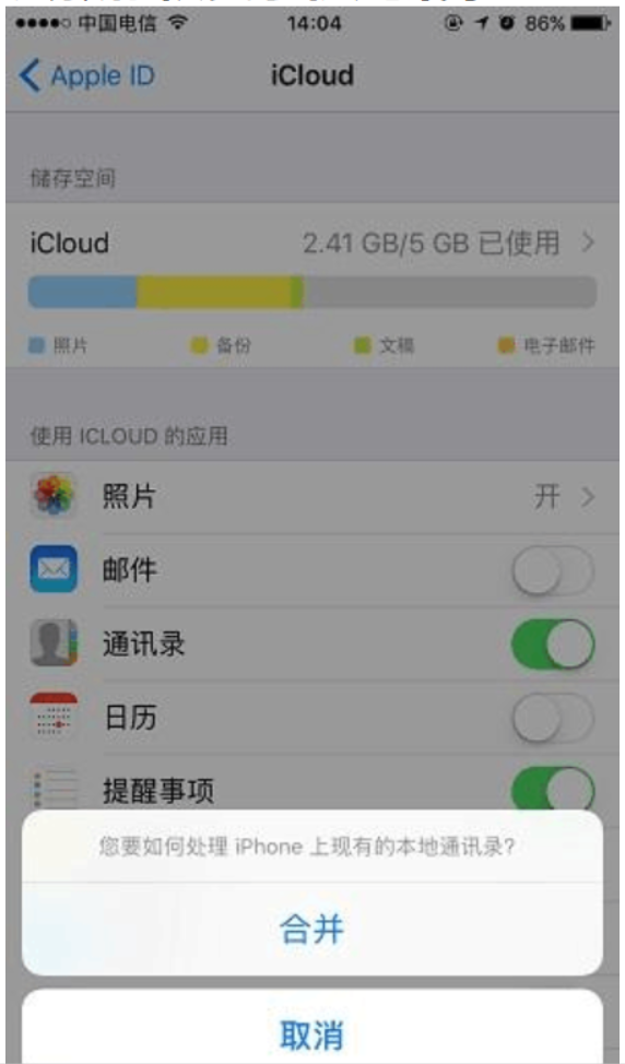 2、滑動打開的按鈕,會提示如何處理現有的本地通訊錄,點擊【合并】即可。