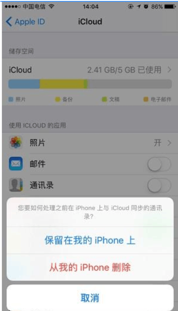 1、打開設置-iCloud,關閉通訊錄按鈕。關閉的時候選擇【保留在我的iP hone】上。