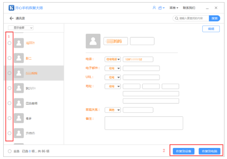 2、進入通訊錄的數據恢復界面,橙色字體是已經刪除的通訊錄聯系人,黑色字體是未刪除的通訊錄聯系人。勾選需要恢復的通訊錄好友,再點擊下方【恢復到手機】就能夠將通訊錄恢復到手機上了;點擊【恢復到電腦】即可備份數據到電腦上了。