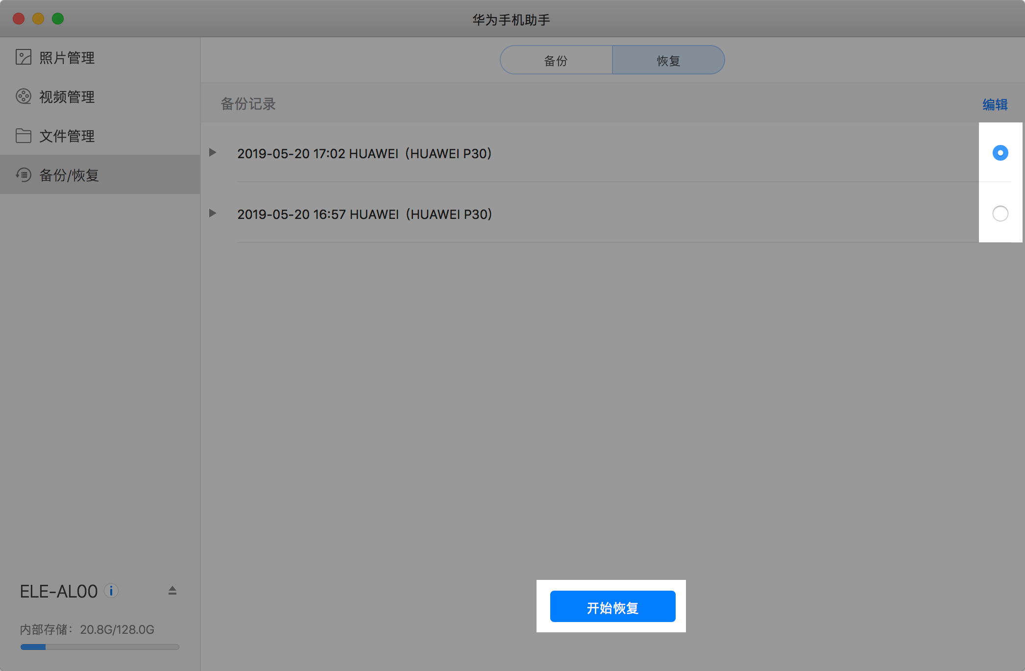 2、點擊備份記錄列表右側的小圓圈,選擇需要恢復的記錄,建議選擇最近的一次備份,然后點擊開始恢復,等待恢復完成