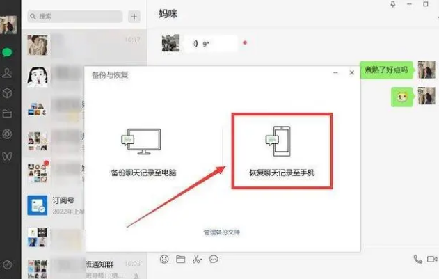 步驟二:在彈出的備份與恢復聊天框中,點擊【恢復聊天記錄至手機】,并且根據手機上的提示進行確定,等待恢復成功。