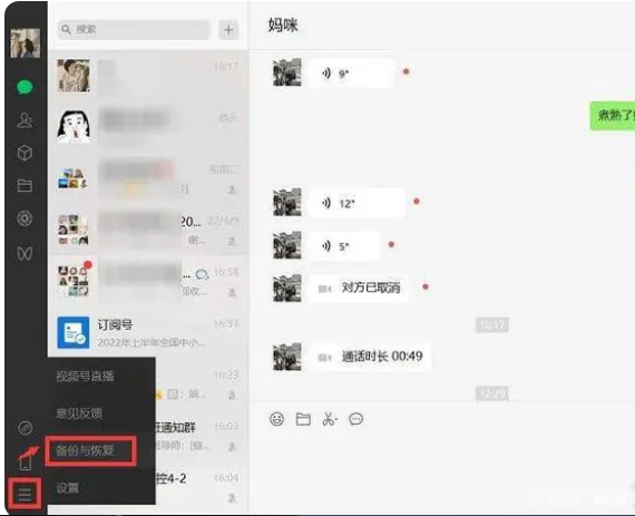 步驟一:在電腦上登錄您的微信,點擊微信主頁面的左下角的圖標,然后點擊【備份與恢復】。