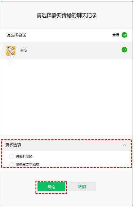 2、選擇要轉移的聊天記錄,可以單擊“更多選項”選擇按時間段恢復,或者僅恢復文字消息。單擊“確定”恢復已經刪除的微信聊天記錄。
