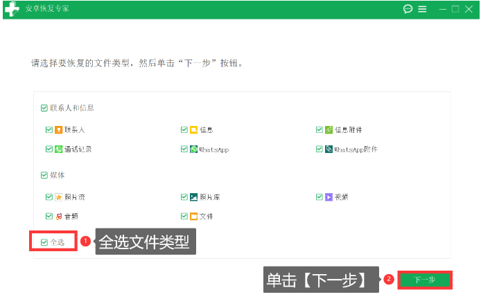 2、軟件識別到接入電腦的安卓手機設備后,程序會自動全選所有手機文件類型為掃描對象,點擊【下一步】讓程序開始掃描手機中所有類型文件。
