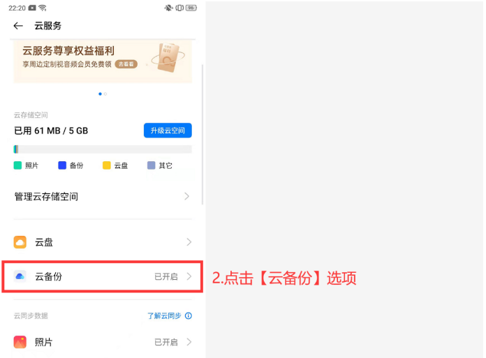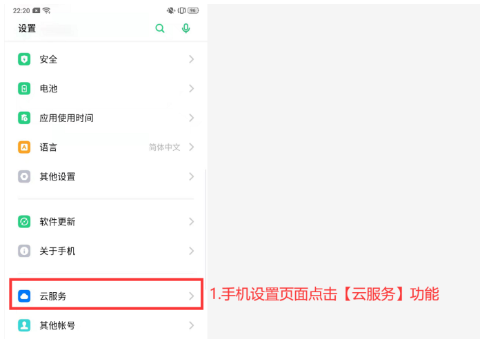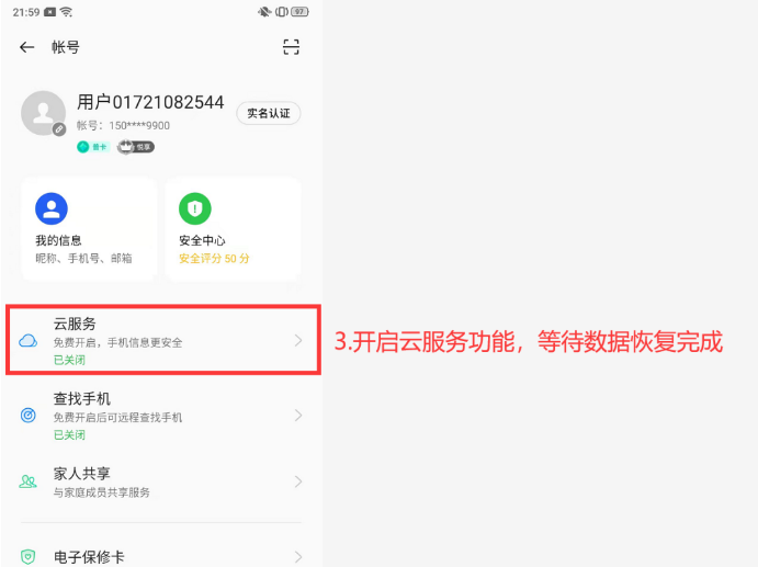 3、在賬號管理頁面內開啟云服務功能,這樣所上傳至云端的手機數據會自動恢復到手機上,等待數據恢復完成即可。