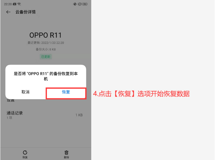 4、點擊【恢復】選項,將該備份文件恢復到手機中。