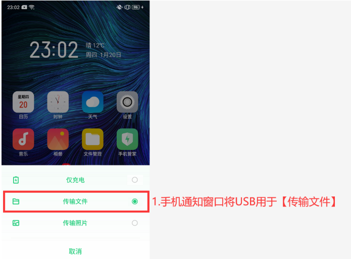 1、將手機接入電腦,并在彈出手機通知后選擇將USB用于【傳輸文件】。