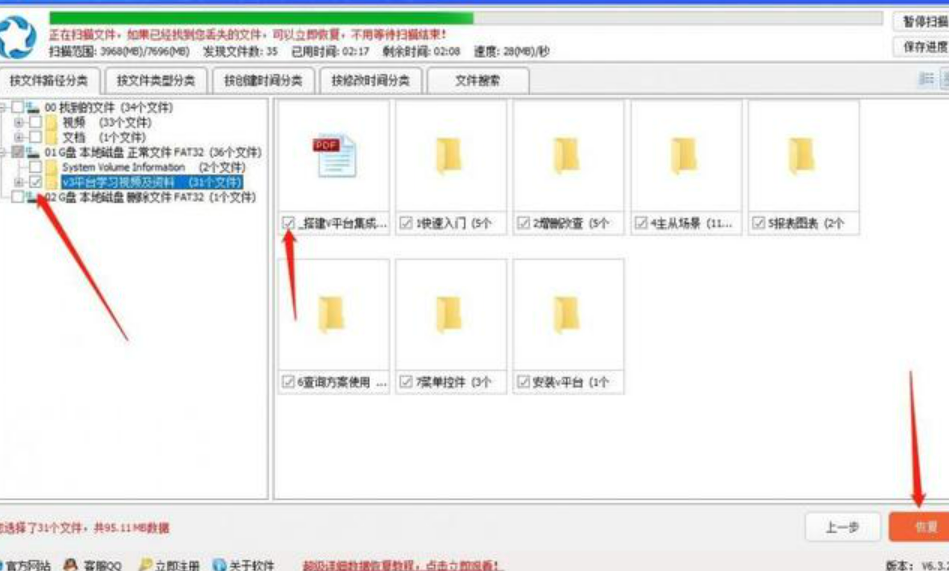 4、稍等片刻,等待磁盤掃描,待掃描出結果后,點擊勾選選中要恢復的文件,單擊“恢復”按鈕。