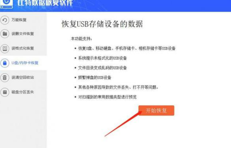 下載好比特數據恢復軟件,選擇“U盤/內存卡恢復”功能。點擊“開始恢復”。點擊勾選選中要恢復的文件。