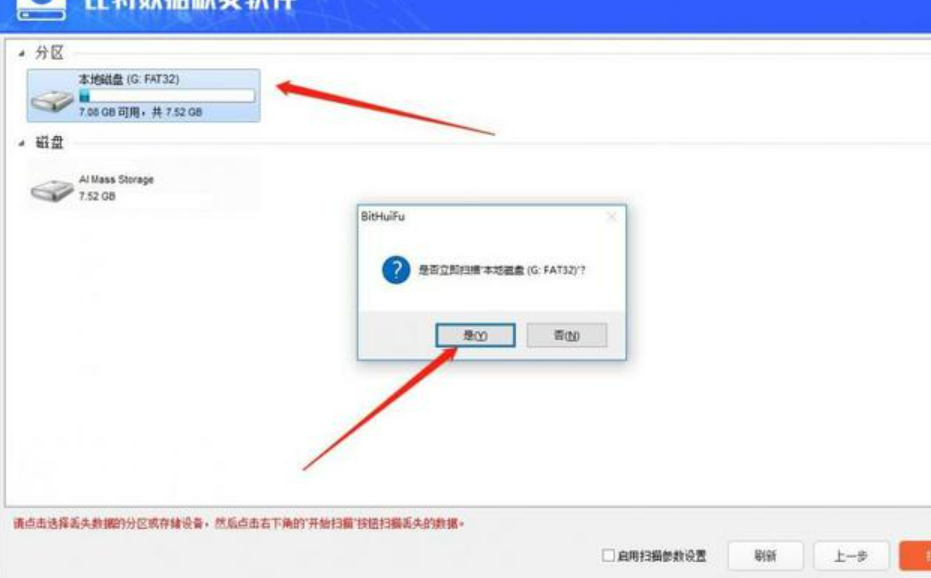 2、選擇好功能后,點擊“開始恢復”。在跳轉的界面中雙擊選擇磁盤,點擊彈框里的“是”進入磁盤掃描。