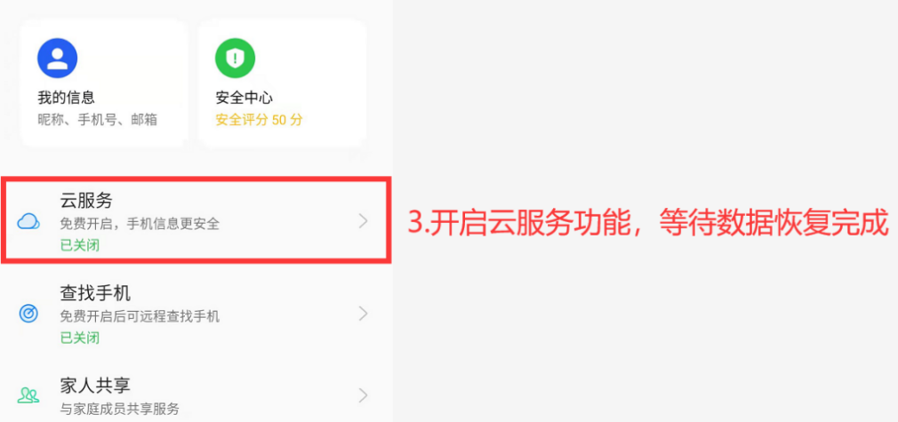 進入登錄界面,在賬號管理頁面內開啟云服務功能。等待數據恢復完成即可。