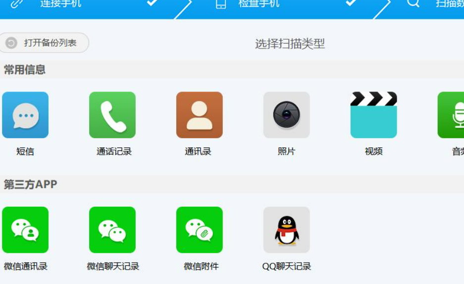 安裝失易得安卓恢復軟件;運行軟件等待手機連接上電腦;檢測手機;選擇掃描的文件類型;選擇要恢復的文件。