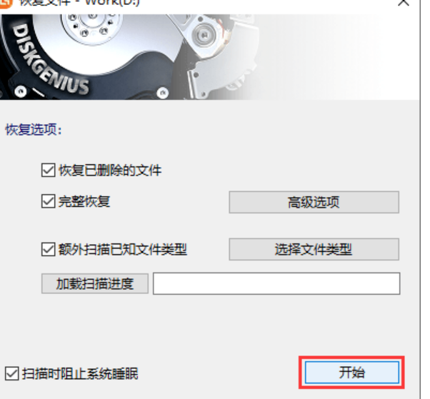 2、在彈出的恢復文件窗口上,點擊"開始"按鈕,讓軟件開始搜索丟失的照片等文件。