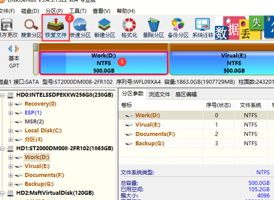 1、在電腦中運行恢復軟件DiskGenius,選中丟失的分區,并點擊"恢復文件"按鈕。