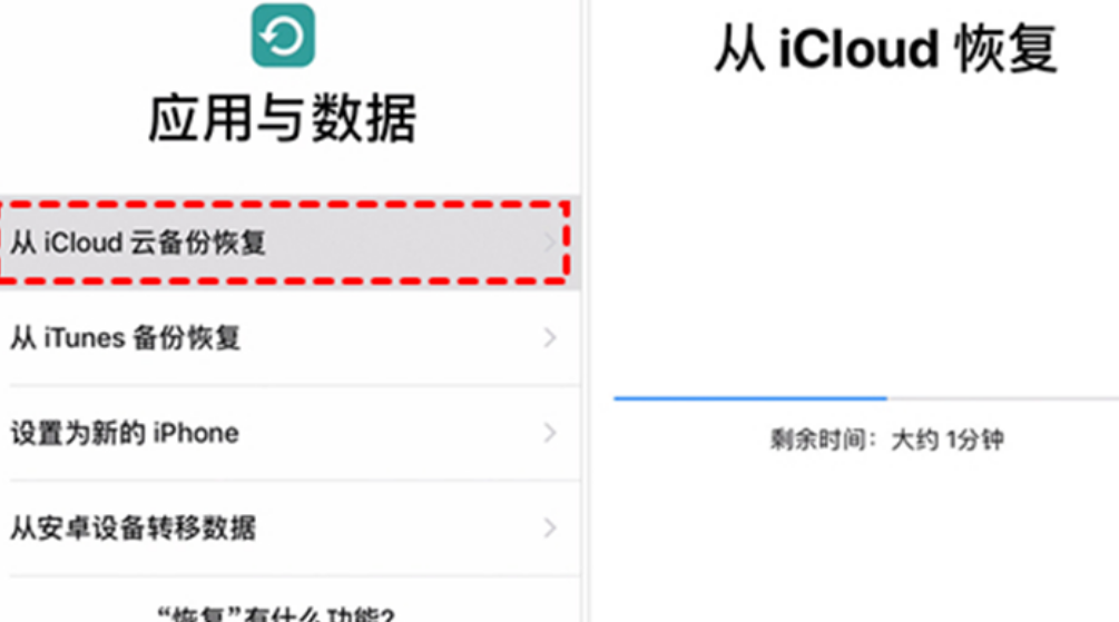 2. 手機將重啟,直到出現“應用與數據”的界面,選擇“從iCloud云備份恢復”,登錄你的Apple