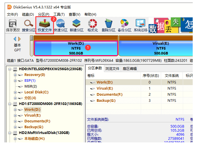 1、下載并打開DiskGenius軟件,找到需要恢復文件的硬盤分區,選中該分區,然后點擊“恢復文件”。