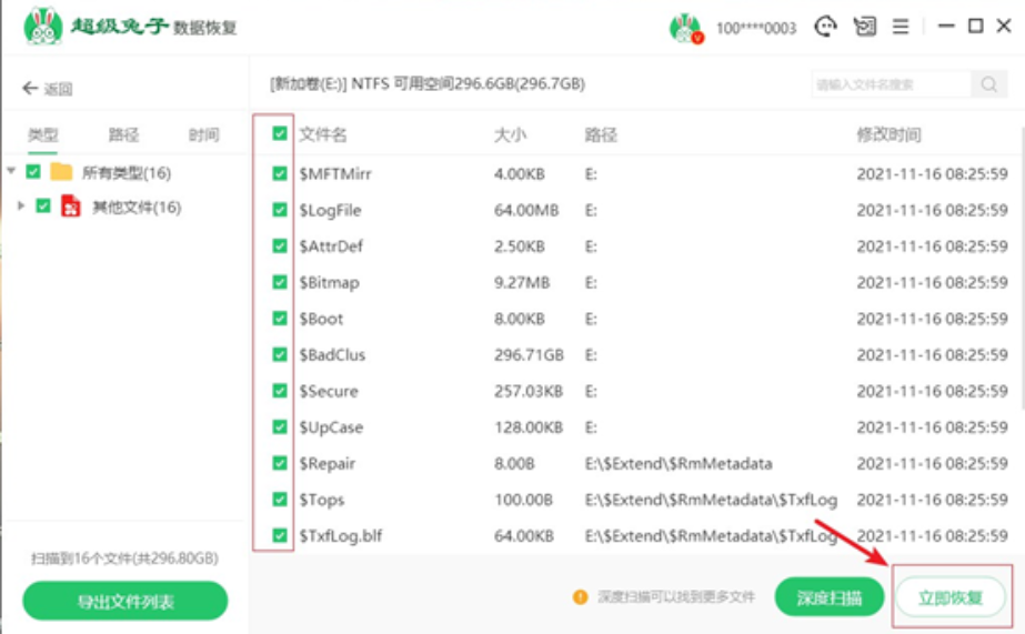 4、等待掃描完成,勾選需要恢復的文件,點擊【立即恢復】。