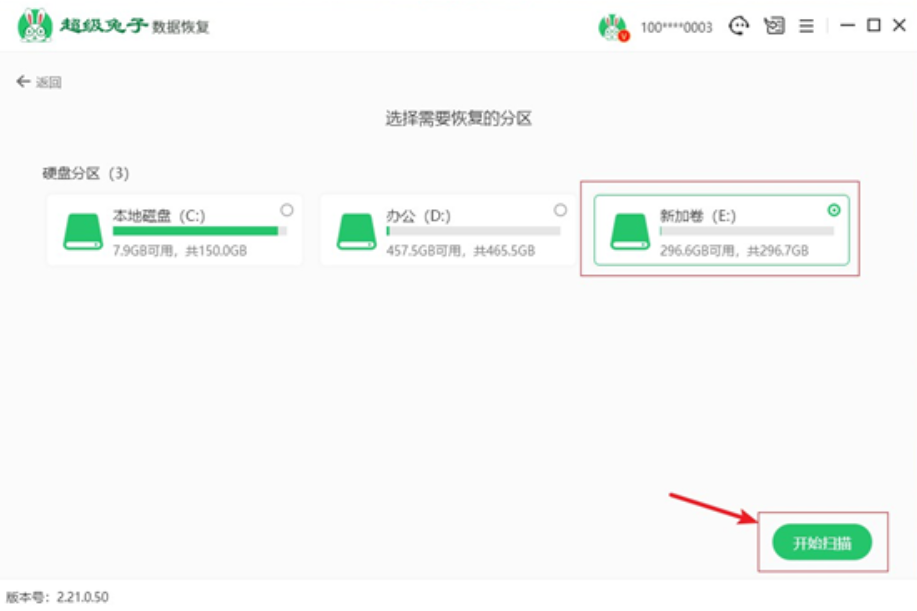 3、接著選擇格式化了的硬盤,比如E盤,選擇后點擊【開始掃描】。