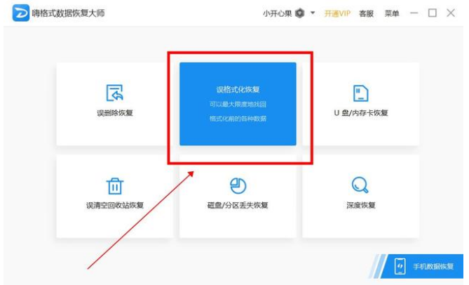 1、點擊打開嗨格式數據恢復大師軟件,軟件總共有六個恢復模式,比如誤刪除恢復、誤格式化恢復、U盤/內存卡恢復、誤清空回收站恢復、磁盤/分區丟失恢復以及深度恢復等等,根據遇到的情況選擇對應就可以啦,點擊“誤格式化恢復”。