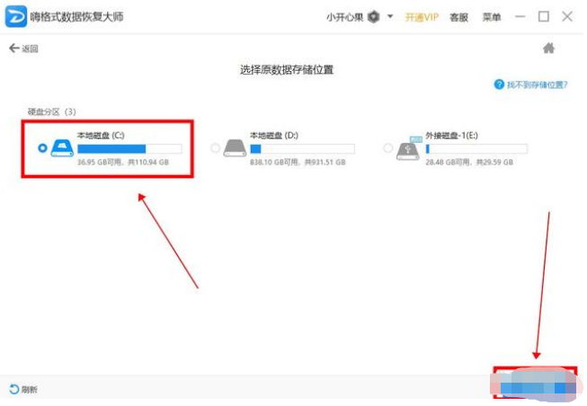 2、點擊選擇我們原來數據保存的硬盤位置,比如C盤,點擊“開始掃描”即可。