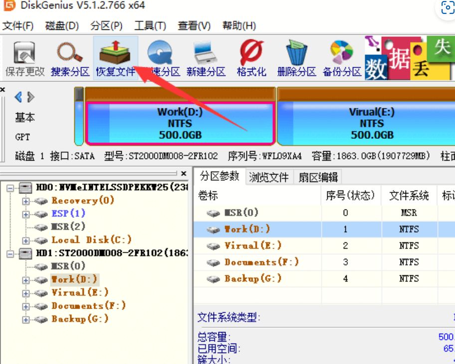 1、下載DiskGenius數據恢復軟件,選擇文件數據丟失的盤,點擊恢復文件。