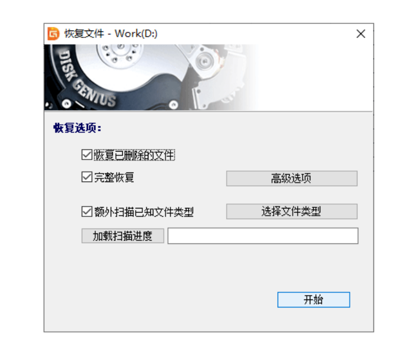 2、點擊勾選全部選項,點擊“開始”按鈕,對文件進行恢復。