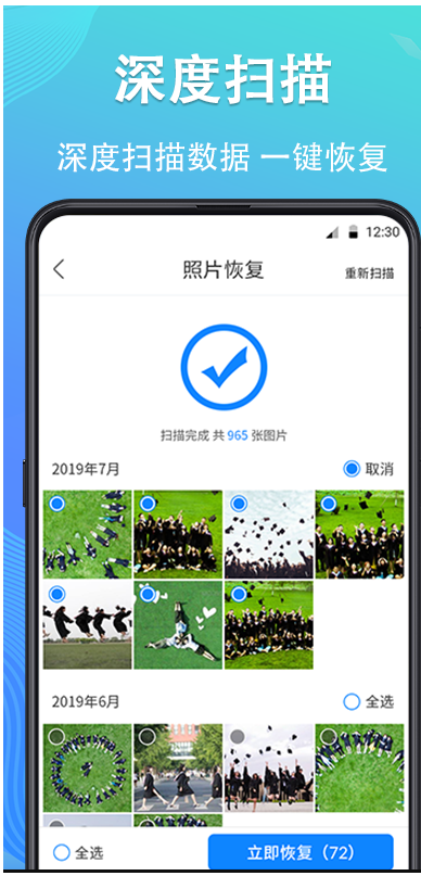 3.手機數據恢復精靈這款軟件掃描快速,兼容性比較高,能夠兼容市面上的安卓手機,滿足不同機型的朋友需求??膳窟M行操作等等,方便快捷。手機丟失的照片、音頻、視頻文件,支持多選、全選,讓數據恢復更快速。支持的照片格式以及視頻文件多。