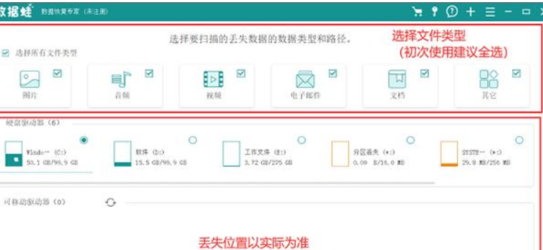 1.首先我們先下載一個數據蛙,然后勾選我們要恢復的文件類型,開始掃碼。