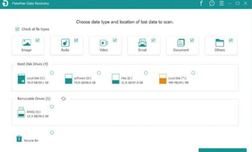FonePaw Data Recovery可以從硬盤、SD卡、存儲卡等等各種介質中恢復已被刪除的圖像、音頻、視頻、電子郵件、文檔、還有其他文件.