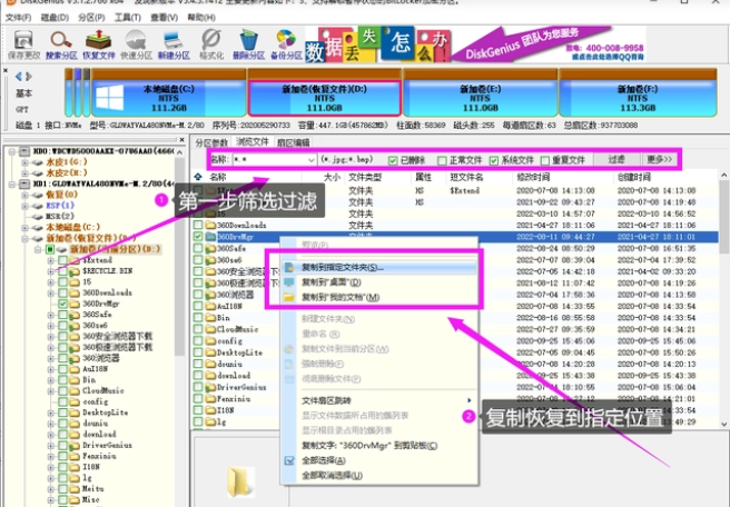 3、搜索完成進行文件類型等的過濾,找到需要恢復的數據文件,然后鼠標右擊復制到指定位置。