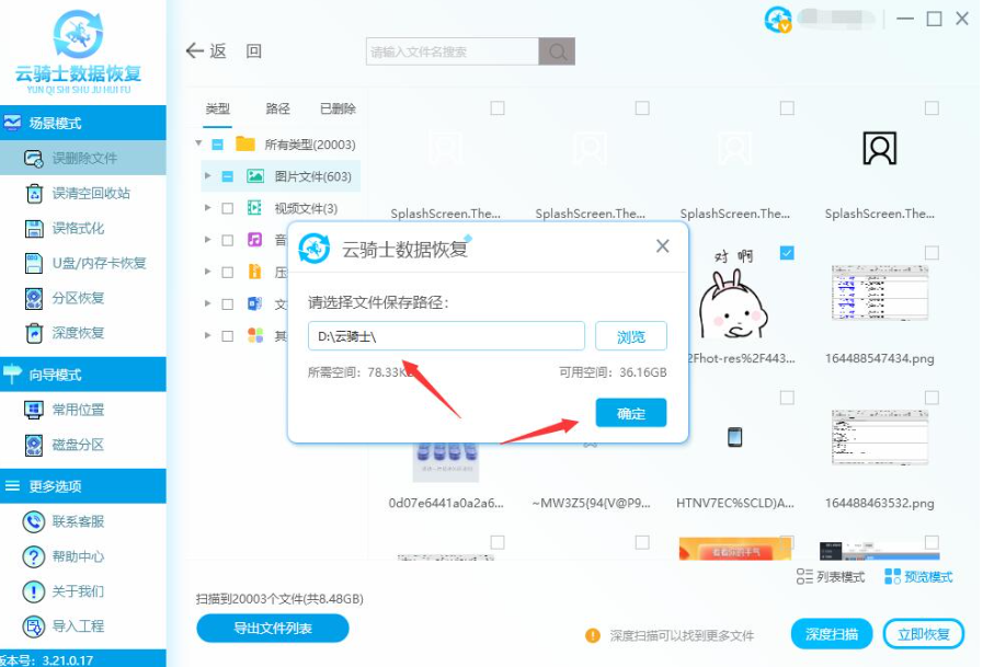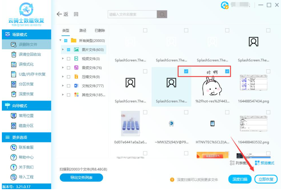 掃描完成后,恢復出來的數據文件將顯示在掃描結果上,點擊右下方的“預覽模式”預覽一些需要恢復的照片文件等,最后勾選需要的文件,點擊右下角的立即恢復按鈕,將數據另存在其他盤中即可。