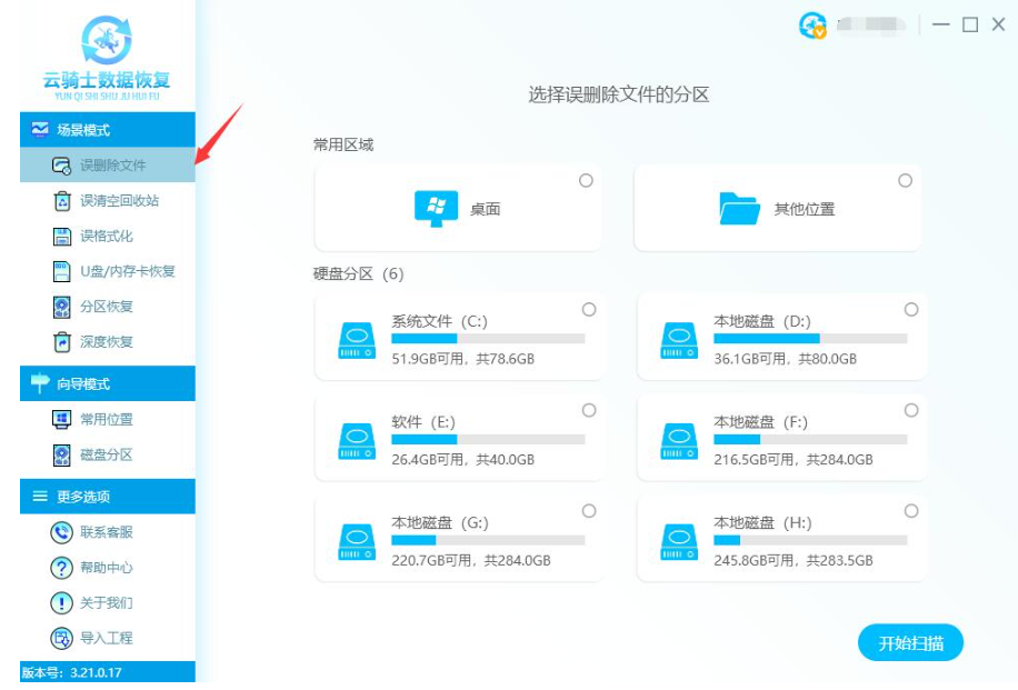 以云騎士數據恢復軟件為例,打開軟件操作界面,選擇“誤刪除文件”選項。