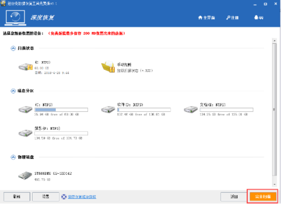 2、鼠標點擊數據之前保存的磁盤位置,對這個磁盤進行“完全掃描”。