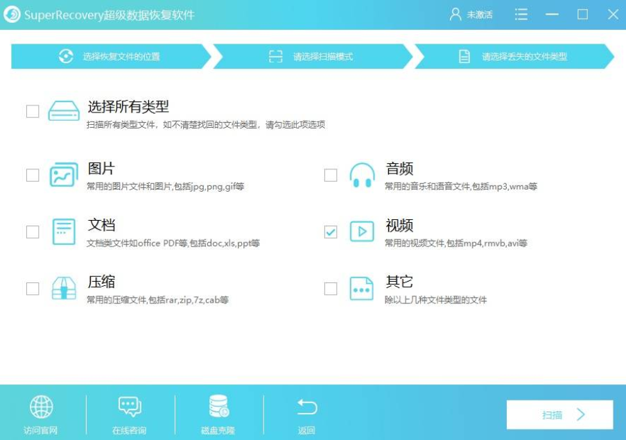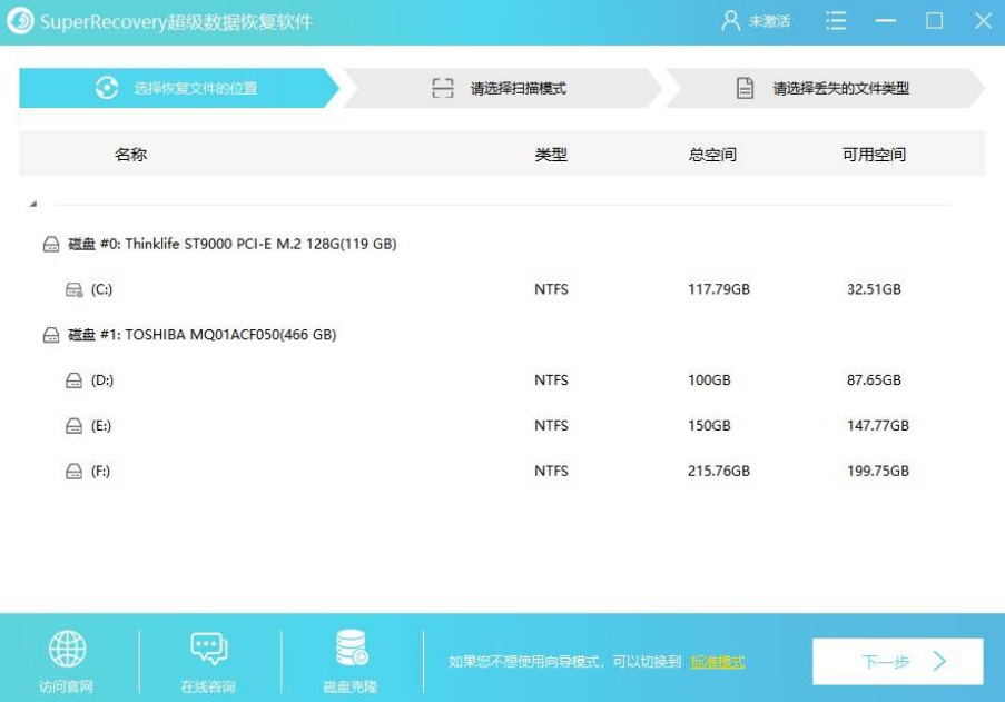 步驟1:首先,雙擊打開電腦上已經安裝好的Superrecovery軟件,并直接進入到軟件的“向導模式”。我們需要做的就是在開始恢復之前,依次設置:需要恢復數據所在的位置、軟件掃描的方式、需要恢復數據的類型等等。