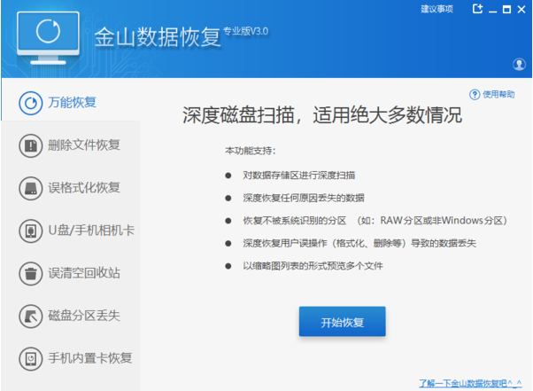 2、點擊打開金山數據恢復大師,根據數據丟失的情況,選擇具體的恢復類別,例如:誤刪除文件恢復。