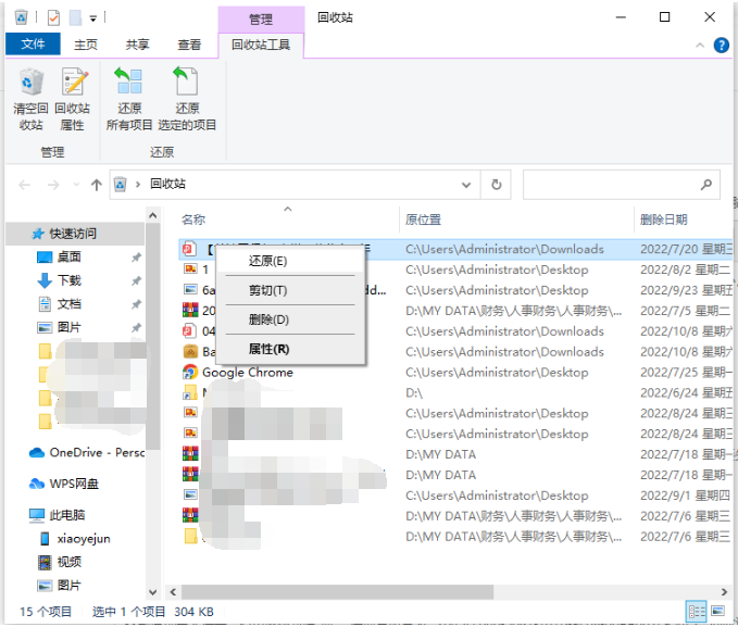如果僅僅是是普通的刪除的文件,那么很多都是直接進了回收站,我們只需要進入電腦系統的回收站中找到丟失的數據即可。選中需要恢復的文件,鼠標右鍵選擇還原即可,文件便會恢復到原來的位置。