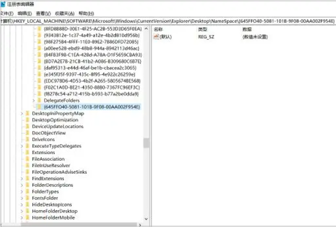 3、將剛新建好的項重新命名為{645FFO40——5081——101B——9F08——00AA002F954E},鼠標右鍵“默認”的那個文件,點擊修改,將數值數據修改為“Recycle Bin”,隨后單擊確定修完成,最后重啟電腦讓修改的數據得到更新即可。