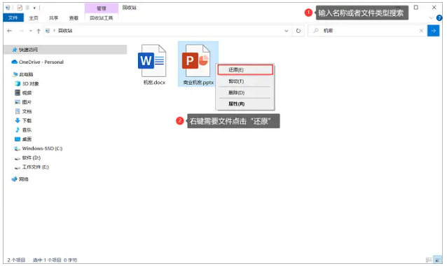 一般只是單純的被右鍵鼠標刪除的文件,電腦都會轉移到回收站里面去,這時我們只需打開電腦系統的回收找,找到需要的文件右鍵選擇還原,這樣就可以將誤刪除的文件恢復到原來的保存路徑,這種僅適用于右鍵刪除的文件,如果是永久刪除的就不行了。