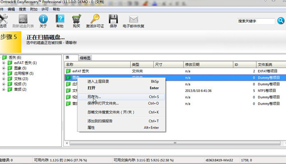 2.硬盤數據恢復軟件對開始E盤進行掃描,把所有丟失的文件都搜索到之后,以列表的形式顯示在窗口左邊,通過點擊每一個文件夾可以仔細查看里面都有哪些文件,在里面找到想要恢復的文件,在文件上直接點擊右鍵“另存為”,如果保存時選擇的是同一個磁盤,軟件還會提示要保存在另一個磁盤中,保證原來磁盤上文件不會被覆蓋和破壞。