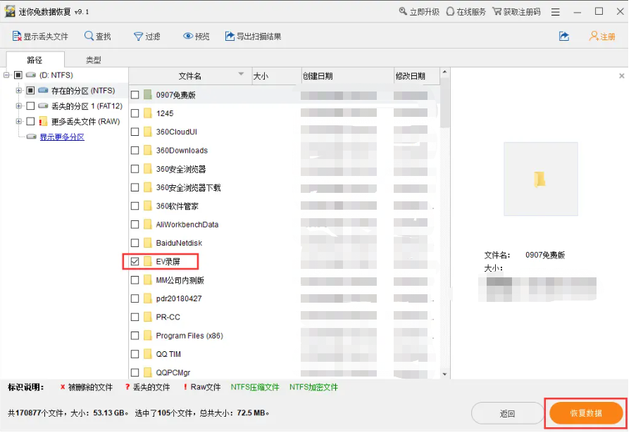 3、等待掃描結束,迷你兔數據恢復工具此時將會顯示所選分區的所有丟失數據,比方說我們丟失的文件在【EV錄屏】中,那么就勾選它,再點擊右邊的【恢復數據】。