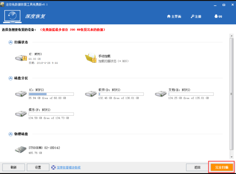 2、點擊數據之前保存的磁盤位置,將會對這個磁盤進行“完全掃描”。