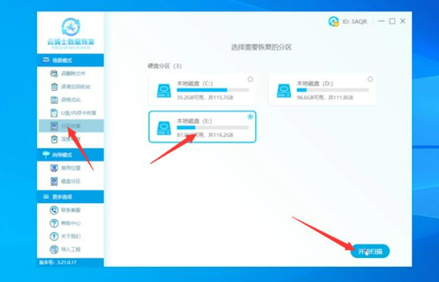 1、首先打開云騎士數據恢復軟件,鼠標點擊分區恢復,選擇我們需要恢復的分區,點擊開始掃描。