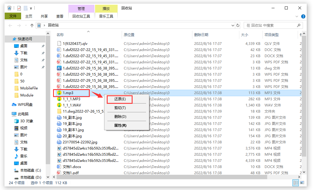 這個方法適用于回收站沒被清空的情況下。電腦刪除的文件一般在回收站里可以找到,用戶點開回收站,找到刪除的文件,點擊鼠標左鍵選中要恢復的文件,點擊右鍵,選擇還原,然后到原來的文件位置查找就可以了。
