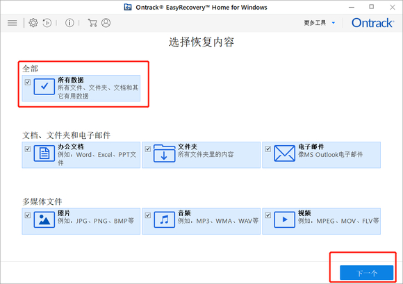 1、硬盤數據恢復軟件使用哪個效果比較好,首先需要打開軟件EasyRecovery,等待軟件自動跳轉到“選擇回復內容”頁面后,勾選“全”下方選項中的“所有數據”,也就是選擇恢復包括所有文件,文件夾,文檔和其它有用數據在內的全部數據,最后點擊“下一個”