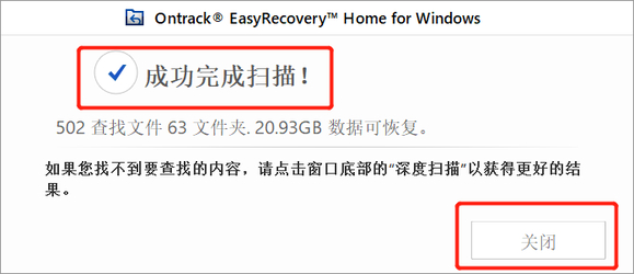 3、軟件開始掃描移動硬盤,在圖中紅框內能夠預覽文件掃描情況,掃描完成后會彈出“成功完成掃描”窗口,隨后點擊“關閉”。