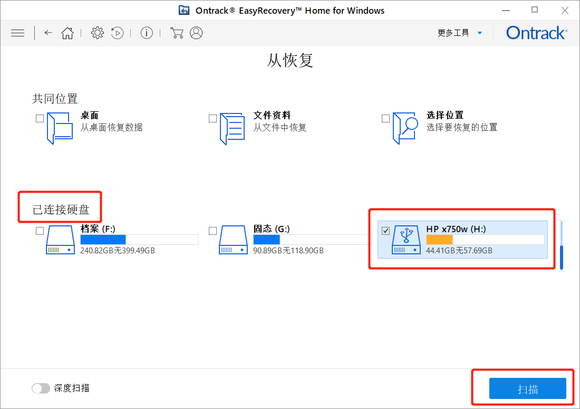 2、點擊“下一個”后,軟件跳轉到“從恢復”頁面,隨后在“已連接硬盤”下方選項中找到連接電腦的移動硬盤,并勾選該移動硬盤,最后點擊軟件頁面右下方的“掃描”,開始掃描移動硬盤。